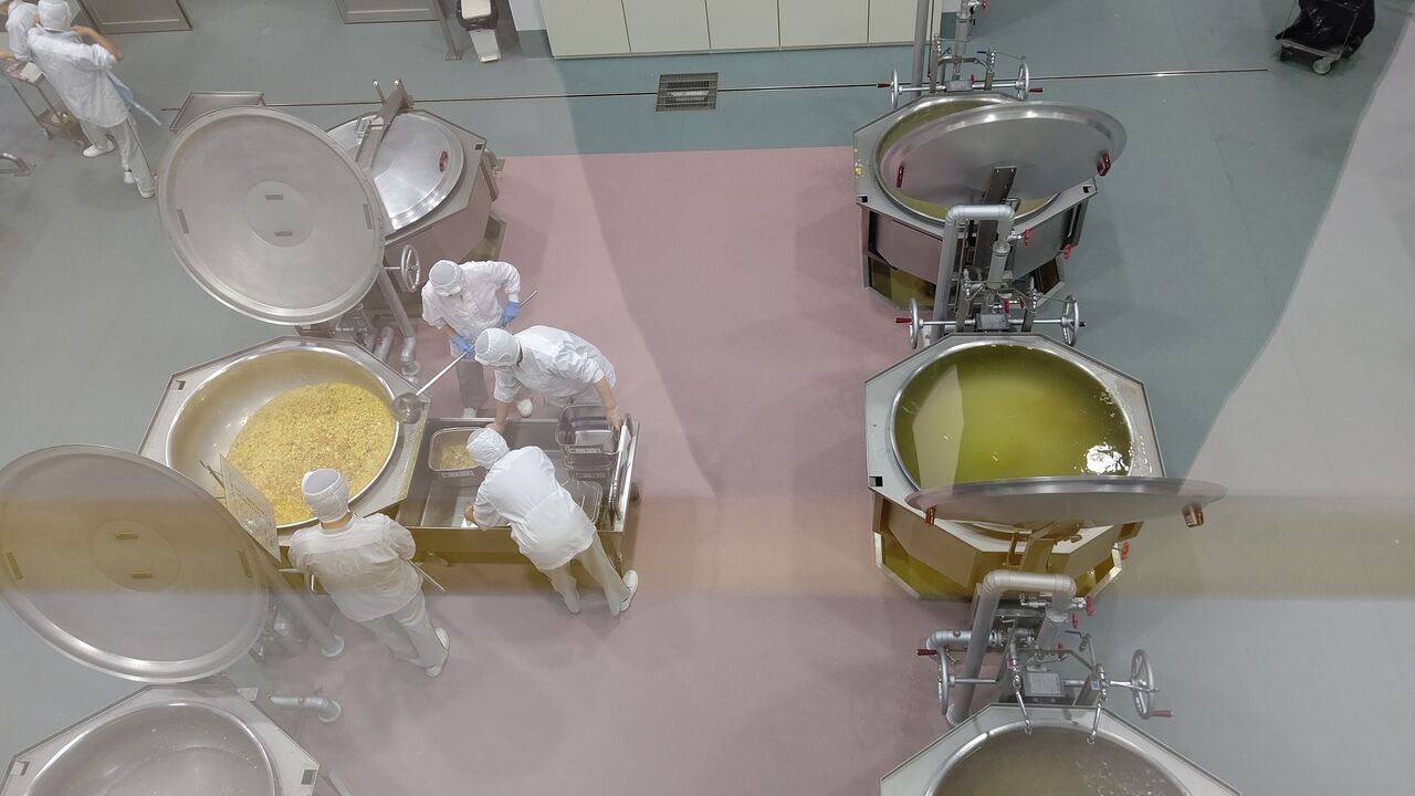 煮物の所では千人分できる大釜が八つ並んでいて、出来上がった卵スープを食缶に分けていました。焼物・揚げ物、あえ物と各部屋に仕切られ、同様の施設がもう一つあり東調理場と西調理場に分かれて、105人が働いています。