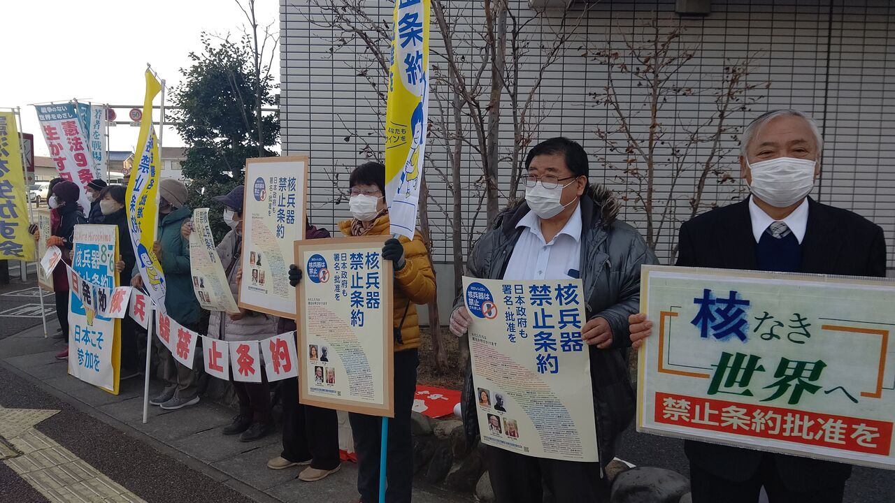 22日伊勢崎平和委員会の呼びかけで、禁止条約の発効を祝い、日本政府は禁止条約を批准せよのアピールを伊勢崎市役所角の交差点で行いました。